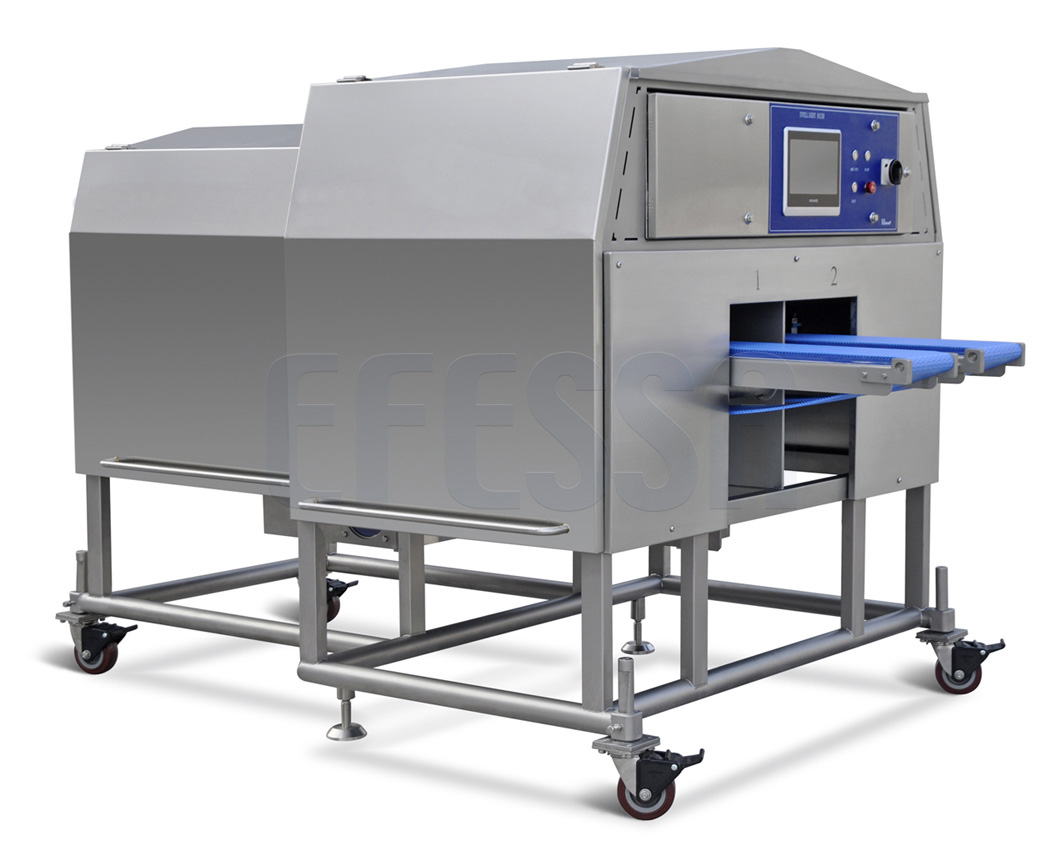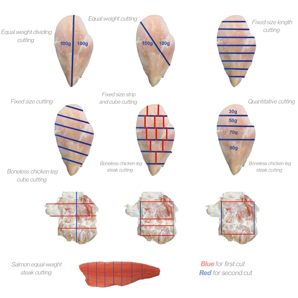 Akıllı dicer iki boyutlu akıllı bir kesme makinesidir. Kesme pozisyonu, zar verimini en üst düzeye çıkaran ve üretim kapasitesini artıran lazer tarama ve yazılım hesaplaması ile sabitlenebilir. Spiral ve dairesel bıçaklar ile tüm kasın küp haline getirilmesi için tam doygunluk sağlar. Sığır eti, tavuk, domuz eti, kuzu eti, deniz ürünleri, peynirle pişirilmiş et ve -2 ℃'den daha düşük sıcaklıktaki diğer ürünler için eti şeritler, biftekler, küpler ve küpler halinde doğru bir şekilde kesebilir. 3D ürünlerin doğru boyutta kesimini gerçekleştirmek için yatay dilimleyici ile birleştirilebilir.
